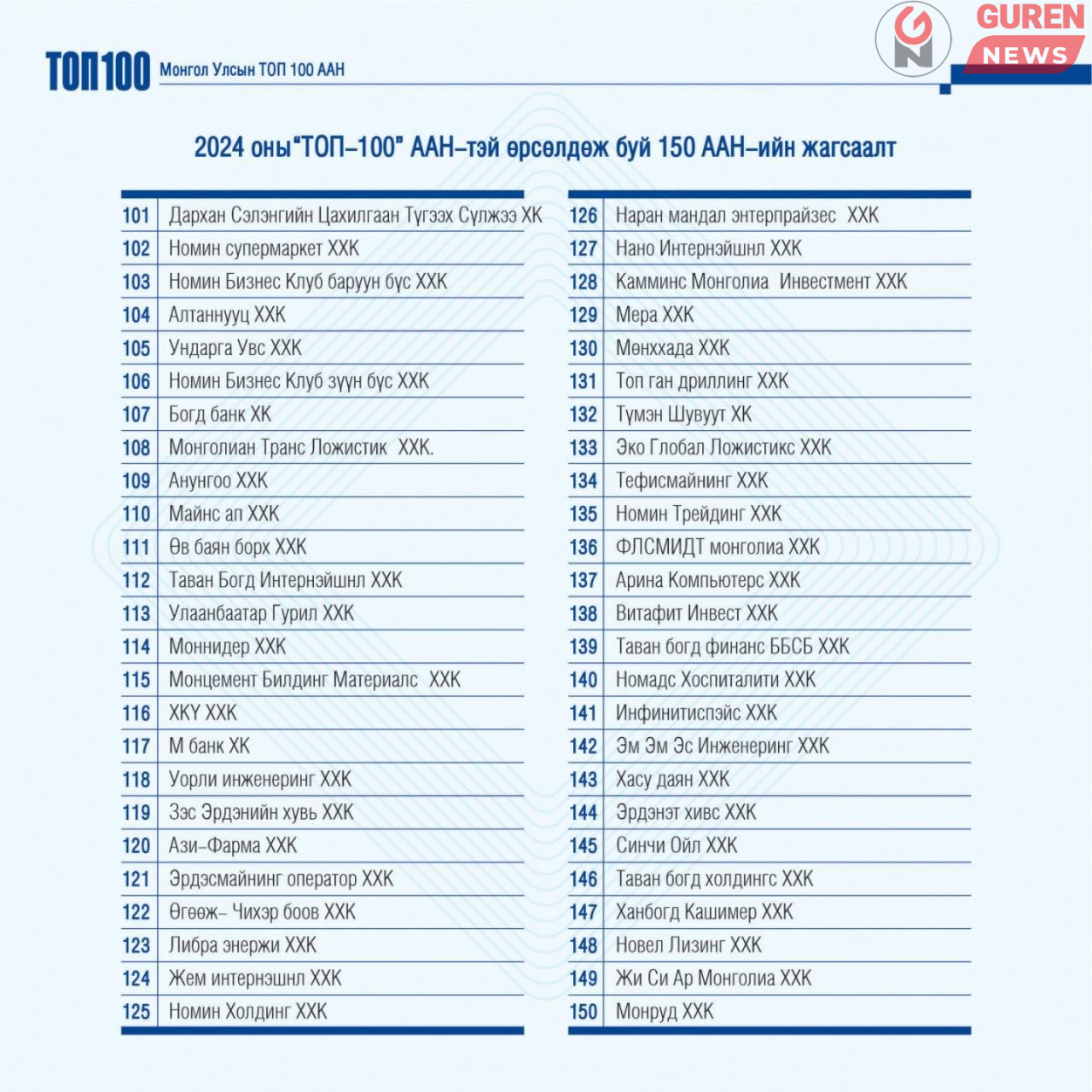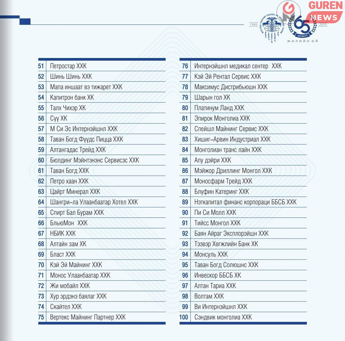 Шинэ жагсаалтыг уул уурхайн гурван компани тэргүүлж, тэдний араас гурван арилжааны банк оржээ. Салбарын хувьд: