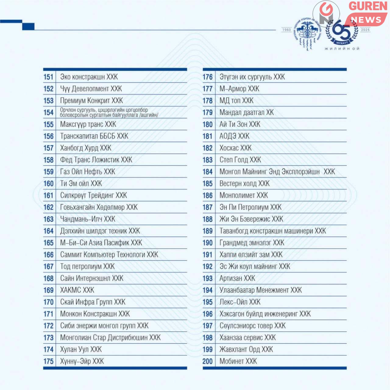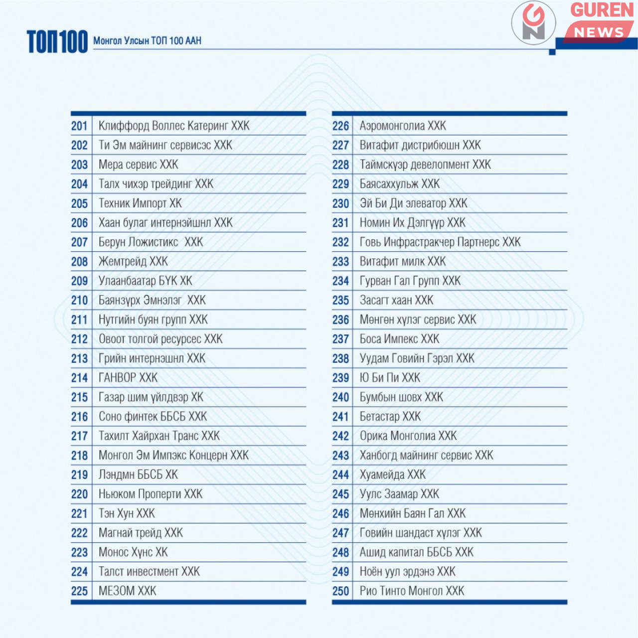 Шинэ жагсаалтыг уул уурхайн гурван компани тэргүүлж, тэдний араас гурван арилжааны банк оржээ. Салбарын хувьд: