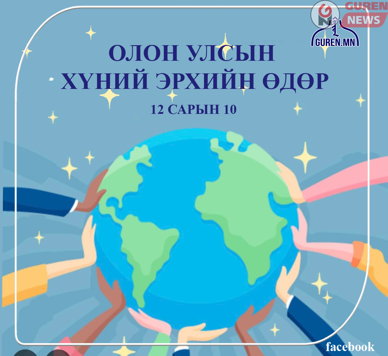 Өнөөдөр хүний эрхийн олон улсын өдөр. Нэгдсэн Үндэстний Байгууллагын Ерөнхий Ассамблейн 217/А/III/ тогтоолоор гишүүн улсууд “дэлхийн бүх улс түмэн, бүх улс гүрэн хэрэгжүүлэхийг эрмэлзвэл зохих нийтлэг зорилт болгон дэвшүүлж”, “Хүний эрхийн түгээмэл тунхаглал”-ыг 1948 оны 12 дугаар сарын 10-ны өдөр баталж, түүний бүх заалтыг дагаж мөрдөхийг уриалсан түүхэн өдөр юм.
