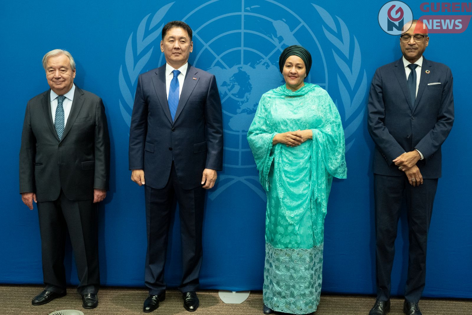 Монгол Улсын Ерөнхийлөгчийг НҮБ-ын Төв байранд хүрэлцэн ирэхэд НҮБ-ын Ерөнхий нарийн бичгийн дарга Антонио Гутерреш албан ёсоор угтав.