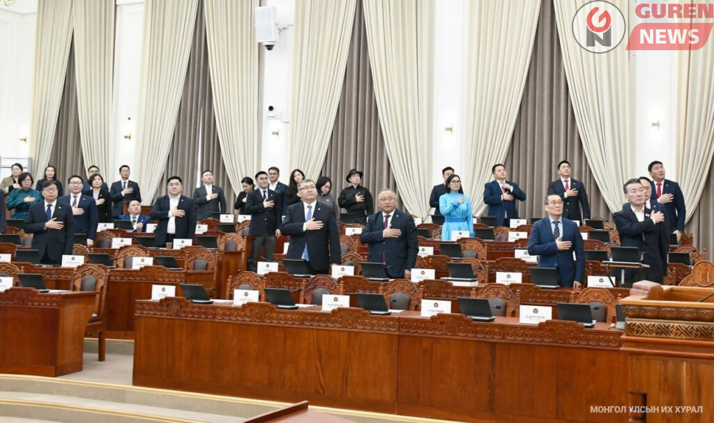 Монгол Улсын Төрийн дуулал эгшиглэж, Улсын Их Хурлын гишүүд болон зочид төлөөлөгчид босож хүндэтгэл үзүүлснээр Улсын Их Хурлын 2025 оны намрын ээлжит чуулган өндөрлөв.