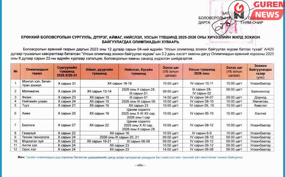 Боловсролын ерөнхий хуулийн 27 дугаар зүйлийн 27.1.5-т заасан “улсын олимпиад, мэргэжлийн болон техникийн боловсролын ур чадварын уралдаан зохион байгуулах журам, ерөнхий боловсролын сургуульд кабинет, лаборатори байгуулах,...
