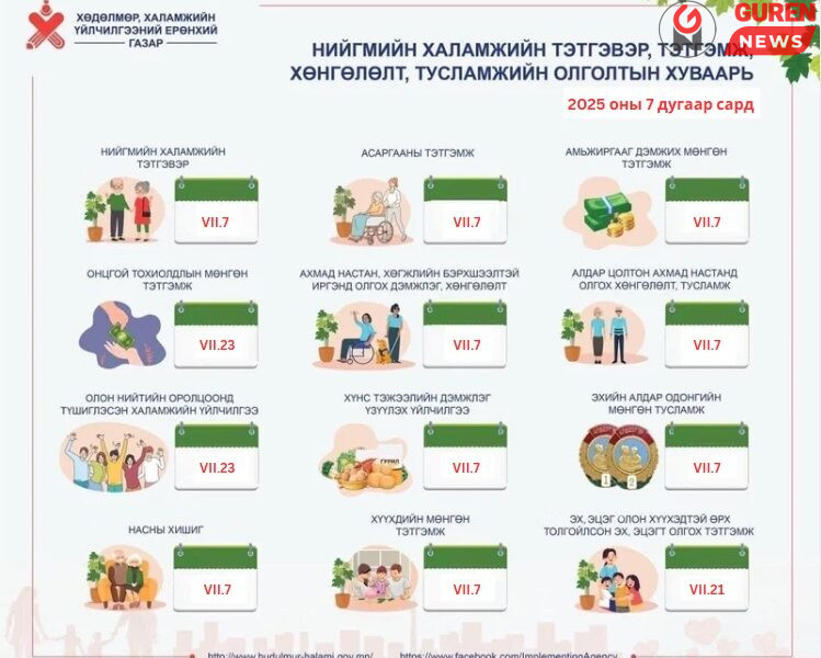 Нийгмийн халамжийн тэтгэвэр, тэтгэмж, хөнгөлөлт тусламжийн мөнгийг ирэх долдугаар сард олгох хуваарийг Хөдөлмөр, халамжийн үйлчилгээний ерөнхий газраас гаргажээ. Хуваарьт тусгаснаар хүүхдийн мөнгийг долдугаар сарын 7-нд олгох...