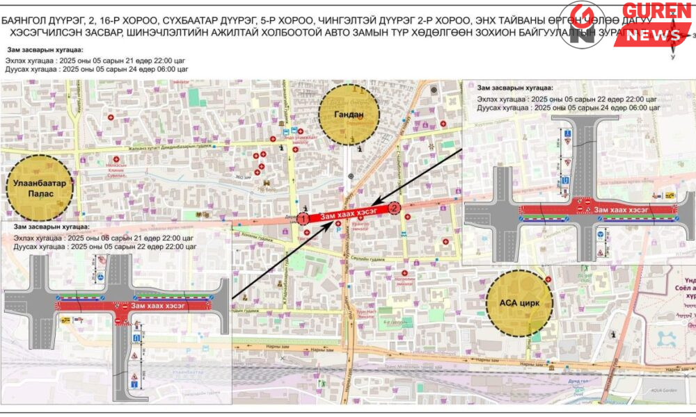 Энхтайваны засвар шинэчлэлтийн ажлын хүрээнд Гранд плазагийн уулзвараас 11 дүгээр сургуулийн уулзвар хүртэлх авто замын зорчих хэсгийн урд талын эгнээг маргааш буюу энэ сарын 21-ний 22:.00...